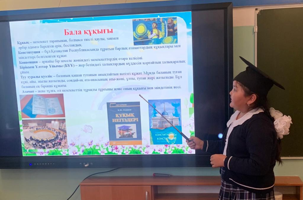 Халықаралық балаларды қорғау күніне арналған «Құқықтық сағат» іс- шаралар шеңберінде 4 “А” сыныбында “Бала құқығы- асыл қазына” тақырыбында құқықтық сағат өтті.Мақсаты: оқушылардың бала құқығы жөнінде түсініктерін кеңейту, әрбір адам өз құқығын біліп, өзгенің құқығын бұзбауға үйрету, құқықтық тәрбие беру.