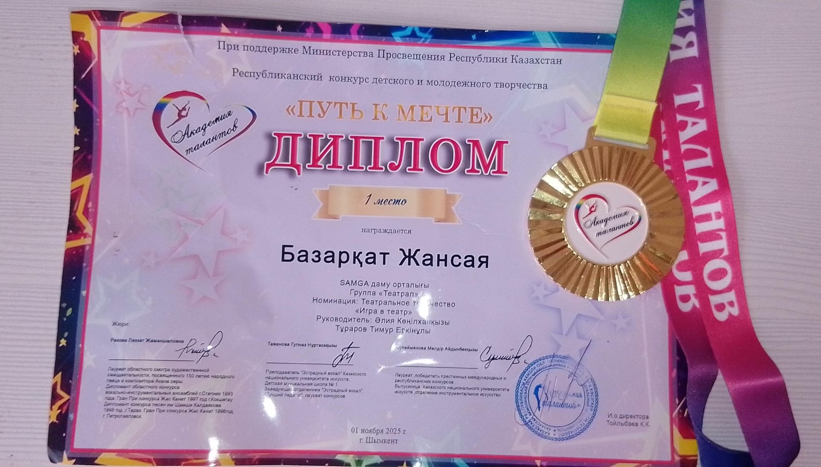 Мектебіміздің 8 "А" сынып оқушысы Базарқат Жансая Шымкент қаласында өткен "Жетістікке жол" республикалық жасөспірімдер шығармашылығы байқауына қатысып "Samga" актерлік шеберлік театр студиясы "Театрлық өнер" номинациясы бойынша "Театр ойыны" бағытында I орын иеленді.  Құттықтаймыз!!!