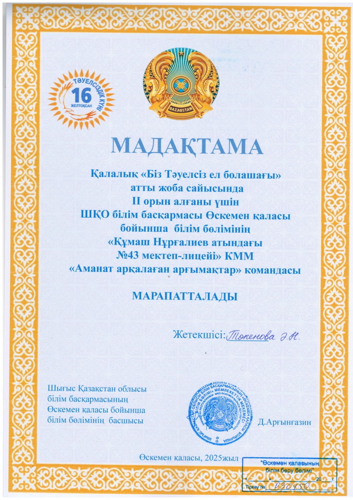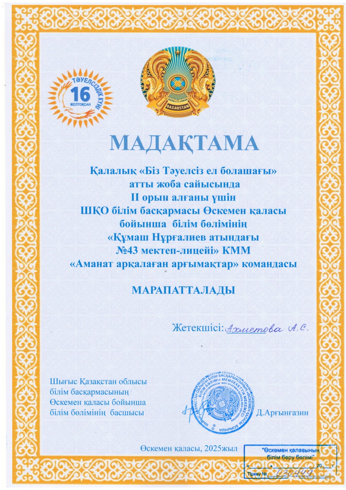 10 желтоқсанда 10-сынып оқушылары арасында ШҚО білім басқармасы Өскемен қаласы бойынша білім бөлімінің ұйымдастыруымен өткізілген «Біз Тәуелсіз ел болашағы» атты жоба сайысында мектеп командасы 2-орын алып, мадақтамамен марапатталды. Мектебіміздің 5 оқушысынан құалған "Аманат арқалаған арғымақтар" командасы өзінің арнайы таныстыруы мен эмблемасын әзірлеген. 1991 жылдан бастап қазіргі уақытқа дейінгі аралықтағы Тәуелсіз Қазақстанның тарихында орын алған ерекше маңызды оқиғаларға тоқтала отырып, Сanva арқылы әзірленген жобаларын ұсынды. Сайысқа қаланың 33 мектебі қатысып бақ сынаған. Жоба қорғауға 5 минут уақыт берілген. Сол уақытты команда құрамы нақты жүйелеп, әр оқушы жеңіске өз үлесін қоса білді. Жобаның қорытындысын 7 санымен байланыстыра отырып, Мәңгілік Еліміздің өрлеуіне байланысты ойларымен түйіндеді.