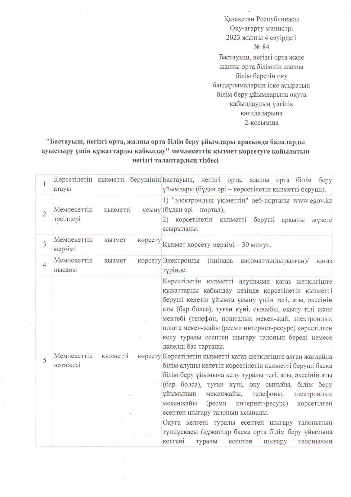 "Бастауыш, негізгі орта, жалпы орта білім беру ұйымдары арасында балаларды ауыстыру үшін құжаттарды қабылдау" мемлекеттік қызмет көрсетуге қойылатын негізгі талаптардың тізбесі