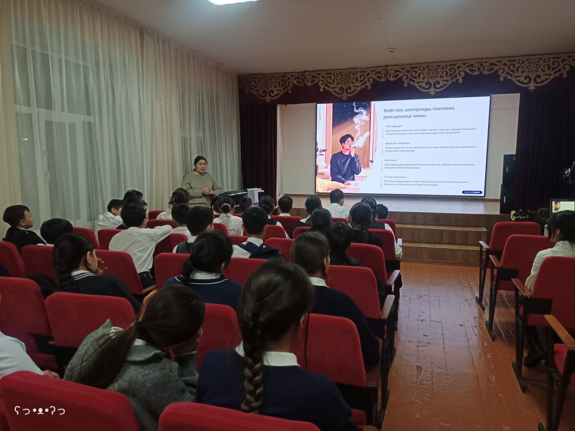 Кездесу барысында вейп пен электронды темекінің зияны, жасөспірім ағзасына тигізетін кері әсері туралы жан-жақты түсіндірме жұмыстары жүргізілді.