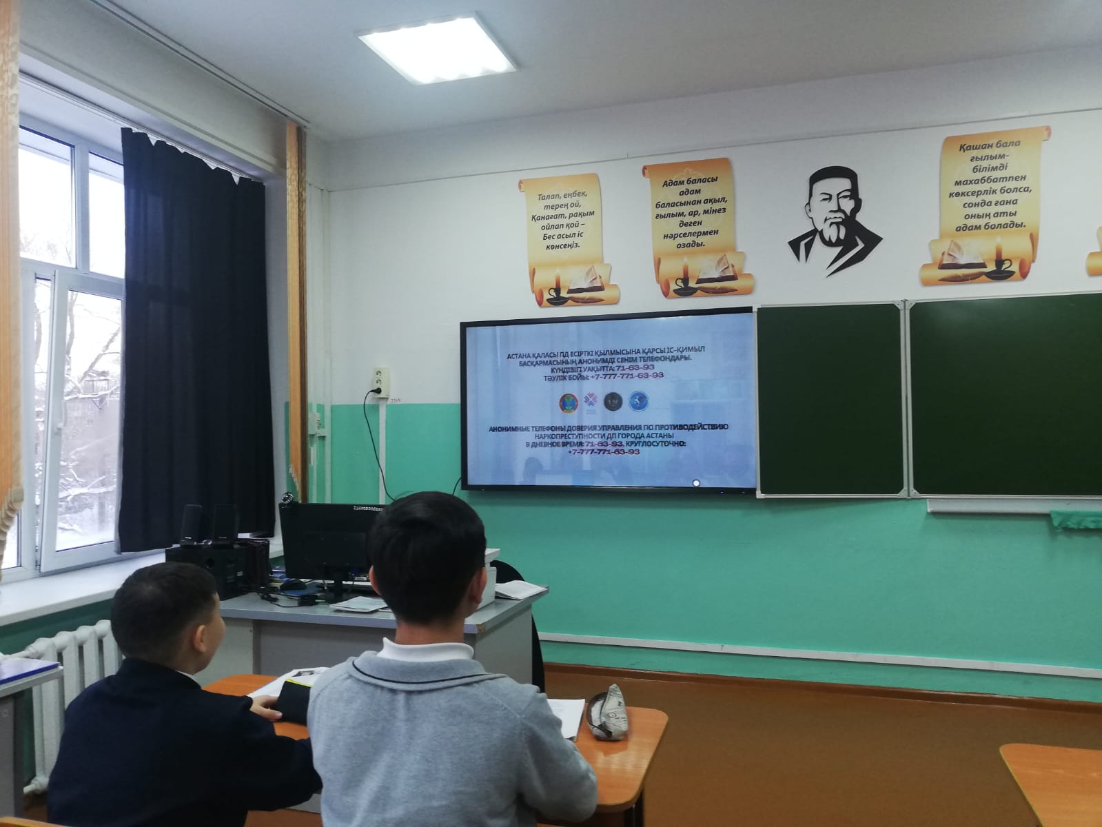 Школьникам қазіргі қоғамда таралған теріс бағыттағы әрекеттер: «закладчик», «кладмен», «минёр» секілді құқыққа қайшы әрекеттердің мәні, олардың қауіптілігі мен заң алдындағы жауапкершілігі туралы мәлімет берілді.